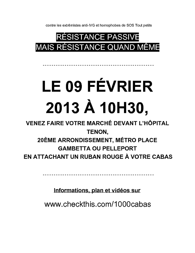 "Faites circuler cette page à un maximum de personnes. Imprimez ce tract et distribuez-le ce samedi et mercredi prochain, sur le marché de la rue de la chine et sur d’autres marchés. Le samedi 09 février doit marquer le tournant de l’occupation par SOS tout petit du carrefour rue de la chine / avenue gambetta. Ils doivent comprendre qu’ils ne sont pas les bienvenus.