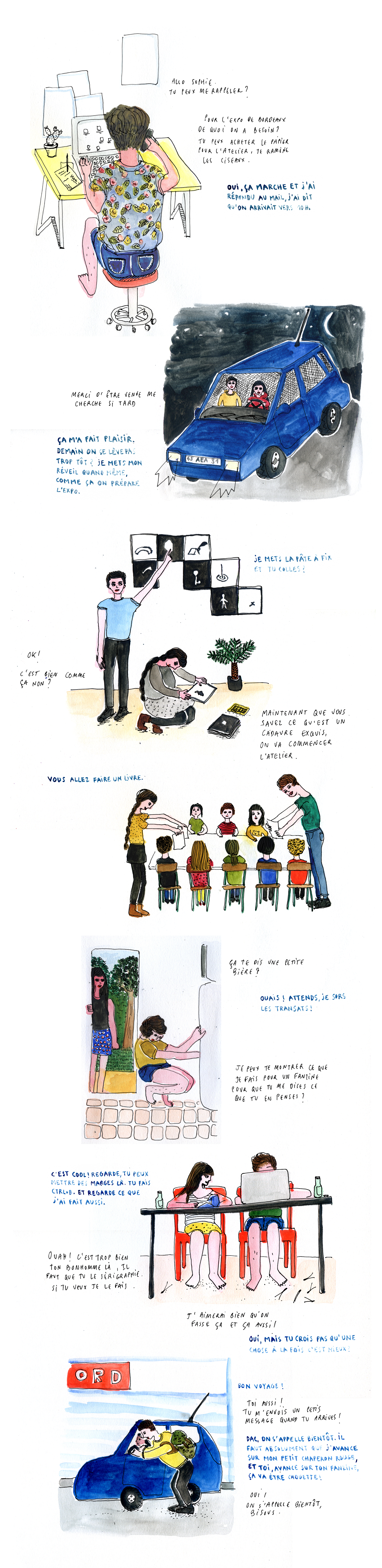 Les images visibles ci-dessus retracent une rencontre significative du mode de fonctionnement de notre binôme dans le travail et dans le quotidien. Les dessins sont travaillés en deux temps, application de la couleur par Sophie puis du tracé noir par Marthe.