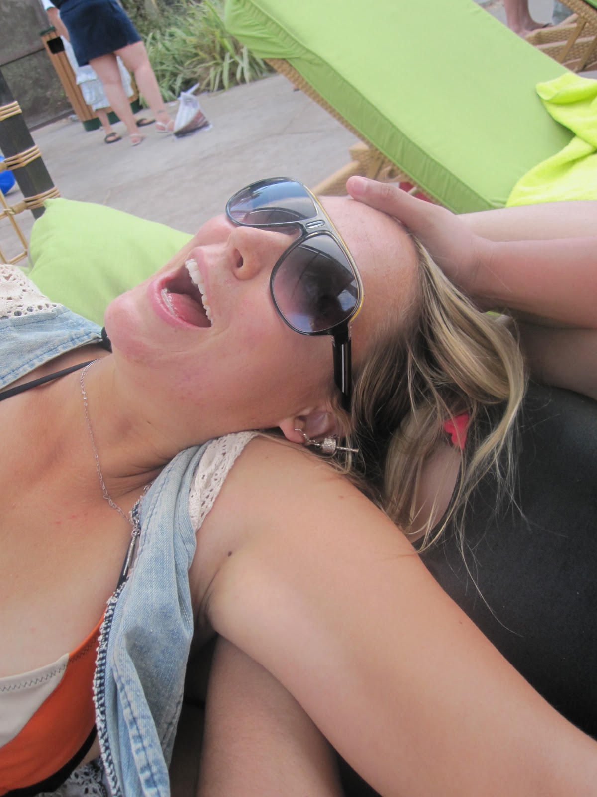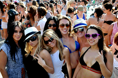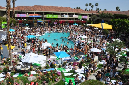 Pour continuer les présentations et plus si affinités, et pour surtout éviter de mourir d’une insolation -on est quand même dans le désert- rien de telle qu’une petite cabane au bord de la piscine le vendredi : 500$, qui logera 8 hysterical lesbians. Puisque le samedi est full, il faudra se rabattre sur deux chaises longues et deux fauteuils pour 4, à 400$ seulement.