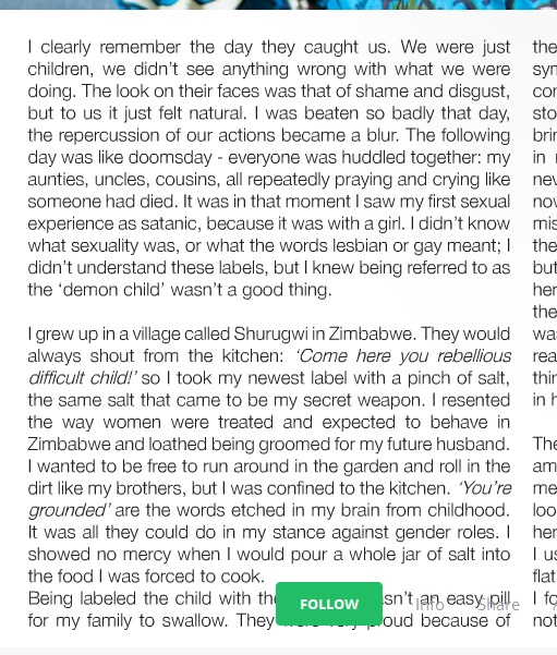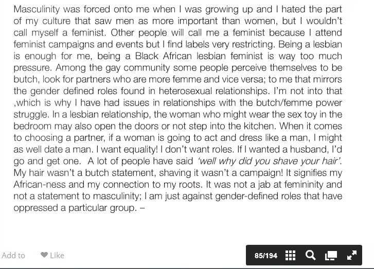 Skye se pose aussi quelques questions auxquelles nous sommes confrontées : doit-on accepter les classifications ? Qu’est-ce qu’être lesbienne/ butch/ fem/ féministe/ noir/ africaine...etc ? Comment vivre à Londres avec certains points de vues liés à sa culture Zimbabwéenne ?