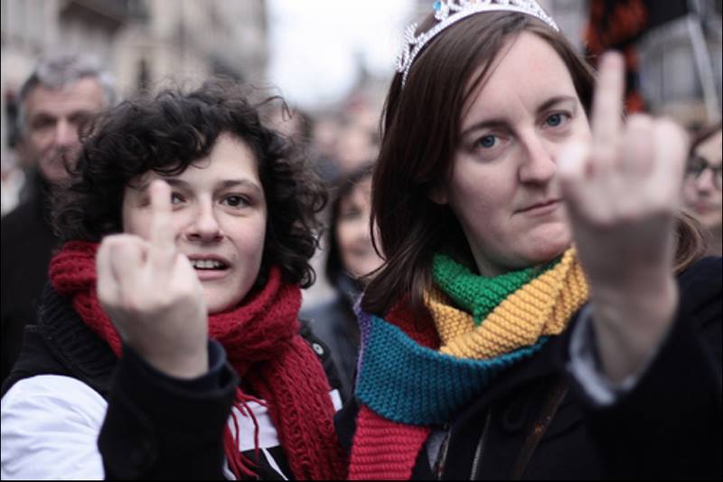J’ai pris une grosse claque le 17 novembre 2012, lors de la toute première Manif Pour Tous. Avec ma cousine Camille (que j’appelle Bouboule, rapport à son surpoids), on était à Montparnasse pour contre-manifester avec les copains. On était un peu lolilol, en mode mini-gaypride, mais après quatre heures non stop de défilé bleu-blanc-rose, j’étais estomaquée. Ouais les mecs, estomaquée.