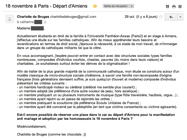 Le 29 octobre, ça fera un an. Un an depuis l’envoi de mon tout premier email destiné à Catherine X. C’est pas une actrice porno Catherine X hein, c’est une personne qui serait – je crois – fâchée si je ne préservais pas son anonymat. Catherine X, c’était la dame qui s’occupait de remplir un car Amiens-Paris pour aller manifester avec les copains de Civitas le 18 novembre 2012. Et avec cet email, j’ai fait mon entrée officielle dans le milieu catho-facho-deuxpointzéro.