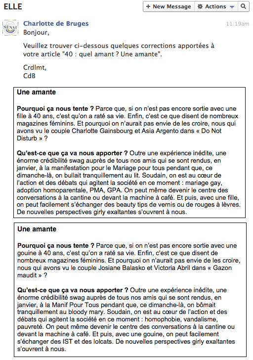 La dame de Elle. Enfin les dames, car malgré ce qu’on pourrait croire à la lecture, elles sont plusieurs à décider. Crédibilité swag de la lesbiennitude, test pour savoir si on est vraiment vraiment hétéro, tous ces magnifiques hommes qui privent les lectrices de Elle de leur anatomie pour cause d’homosexualité… chaque article mentionnant les homos, c’était une catastrophe. Je leur ai envoyé mes corrections à plusieurs reprises, ça n’a jamais été pris en compte.