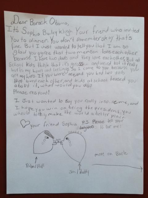 Je m’appelle Sophia Bailey Klugh, votre amie, celle qui vous avait invité à diner. Vous vous souvenez pas ? OK, c’est pas grave. Mais je voulais juste vous dire que je suis super contente que vous êtes d’accord que deux hommes peuvent s’aimer parce que j’ai deux pères et ils s’aiment, Mais à l’école les autres enfants pensent que c’est dégoûtant et bizarre mais ça me blesse mon cœur et mes sentiments donc je vous écris parce que vous êtes mon héros. Si vous étiez moi et vous aviez deux pères qui s’aiment et les enfants à l’école se moquaient de vous, vous ferez quoi ?