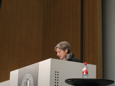 Moi même je n’y croyais pas : Judith Butler venait faire une conférence (au titre apocalyptique "Frames of War") à l’Université FU, on avait réservé nos places, mais un email nous communiquait de venir quand même super tôt parce que ils attendaient beaucoup de monde. OK, elle est connue, on ne la voit pas très souvent en Europe et la salle de conférence doit être trop petite... mais quand même, il ne faut pas exagérer.