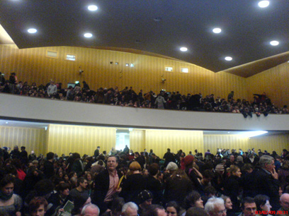 On joue le jeu, la lecture ce mardi commençait à 7h et demie du soir et on se pointe une heure et demie avant c’est à dire à 6h pile, dès l’ouvertoure des portes. A la sortie du métro, dans la banlieue de Berlin, la nuit, j’ai l’étrange sensation d’avoir 16 ans et d’aller voir U2 avec les camarades de lycée. Trouver le chemin vers la conférence c’est peu compliqué, il suffit se suivre la foule de punk, freaks, crêtes et piercings. Mais arrivée, mauvaise surprise : toute les places sont déjà prises, il faut aller dans un deuxième amphi voir la conférence à la télé...horrible ! Sans compter que ce deuxième amphi est aussi complet, merde. Donc nous, on fait les frenchy nonchalants, ou les italiens qui trichent, ça dépend des goûts, et avec une ruse, on passe outre les gardiens de la salle principale, magiquement on est a coté du podium, début, en attendant la Judith, qu’on nous dit est peut être coincé à Londres à cause de la neige.