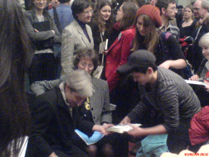 Une heure et demie après, le lecture de son nouveau texte "Frames of War" finie, elle redescend. Les groupies et petites fans de tous genre, l’entourent pour lui demander des autographes, les profs barbus veulent lui serrer la pince. C’est littéralement un bain de foule. Je suis toute émue comme après un concert rock.