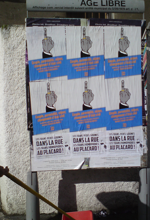 "Les durEs à queers ont recouvert ce week-end les murs de Nantes d’une affiche (photos ci-jointes) qui rappelle que, lesbiennes, gays, bis, trans et intersexes, nous voulons l’égalité des droits, tout de suite, maintenant.