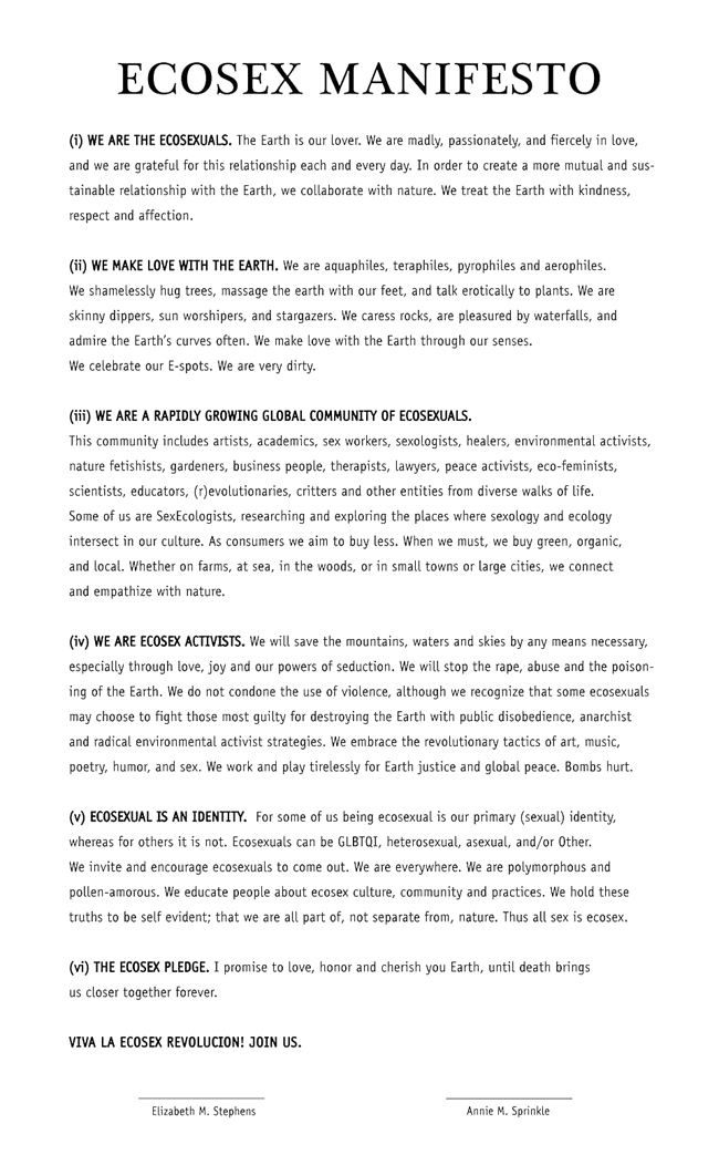 Annie Sprinkle et Elisabeth Stephens organisent des rassemblements d’artistes, de performeurs, de théoriciens, d’activistes et autres du monde entier pour célébrer, proclamer, débattre, performer, créer et stimuler tout ce qui émerge dans les champs de la SexEcologie, de l’identité Ecosex et des nombreuses pratiques qui en découlent.
