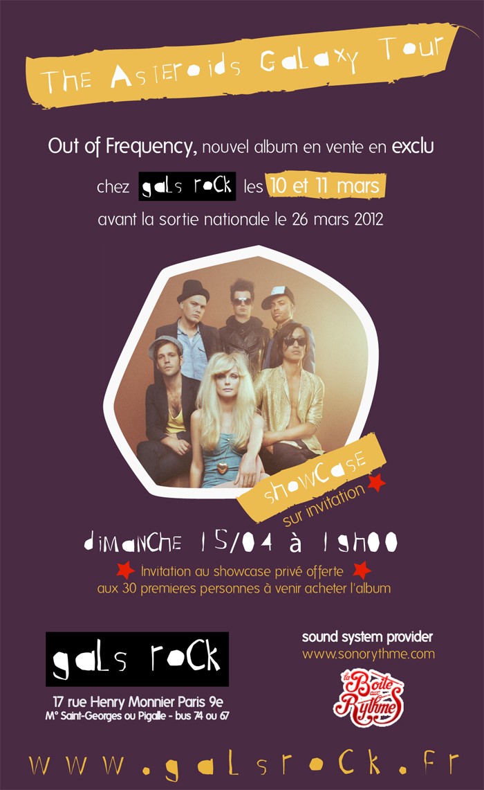 "De projet musical conçu dans une chambre entre amis, The Asteroids Galaxy Tour est devenu un Big Band psychédélique visionnaire et prometteur. Aujourd’hui, presque trois ans après la sortie de Fruit, le groupe revient avec Out of Frequency, un album qui fait appel à cette liberté de création. Un album qui aura demandé presque un an de travail et qui n’est que la suite logique du partenariat musical qui unit les deux membres fondateurs du groupe, Lars Iversen et Mette Lindberg. S’inspirant des grands groupes cultes, d’émissions retro de télé danoises pour enfants, ainsi que des vieux disques de Parliament, Mette et Lars, ont peaufiné une musique qui réussit à sonner à la fois classique et futuriste. L’album est le produit d’un glorieux désordre : mélange de morceaux de soul cuivrée, délires psyché-pop qui auraient sans aucun doute plu à Pizzicato Five, ambiance dance-floor ou funk-tastic. L’album en lui-même propose une seule et même aventure sonore, mais chaque morceau a son identité musicale propre.