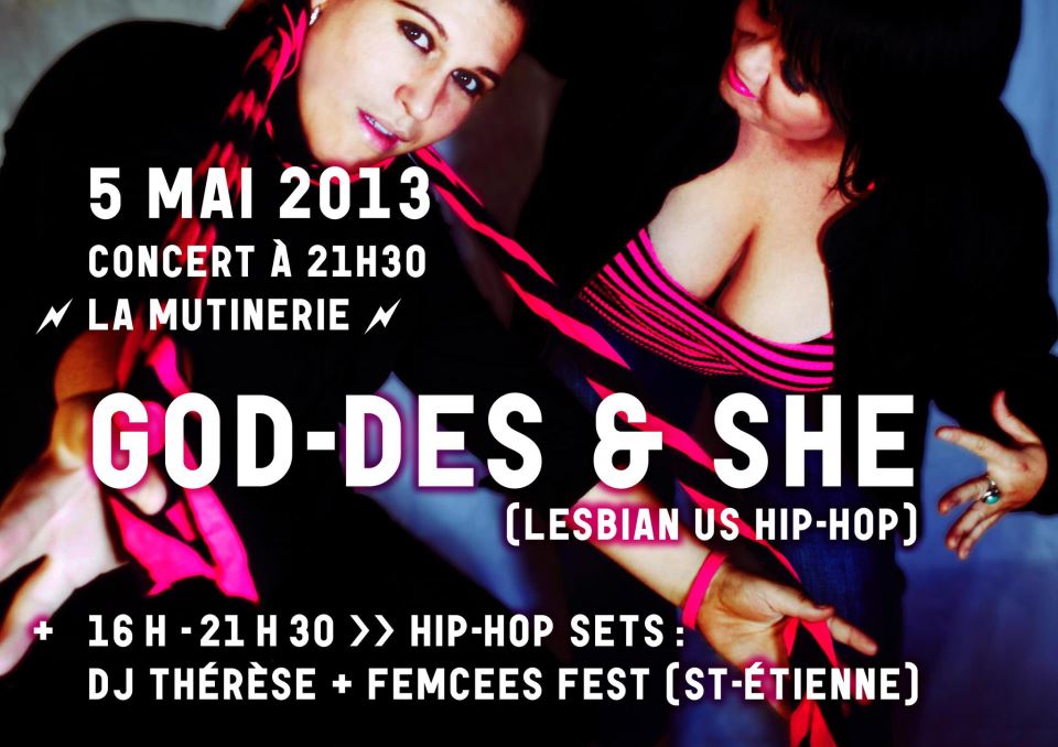 God-des & She est un duo lesbien américain de hip hop. Basé à New York, il se produit sur scène depuis 2004 et est connu pour son son qui tue et ses textes crus. Elles ont joué dans le monde entier et ont partagé la scène avec Lady Gaga, Salt n’ Pepa, SIA, ...