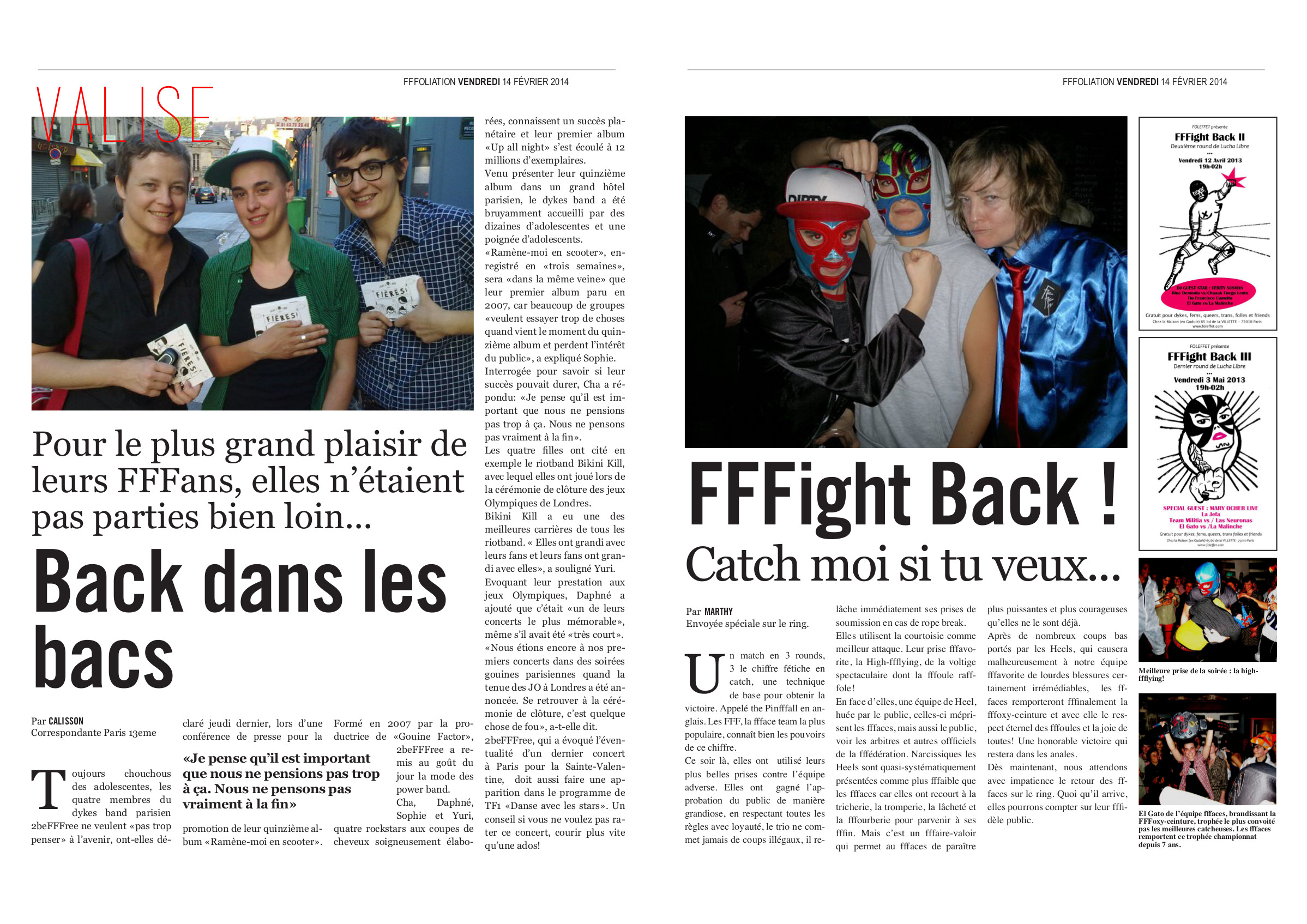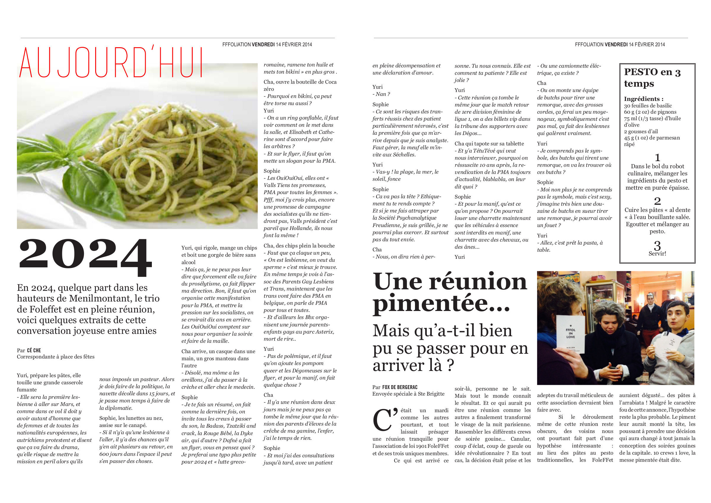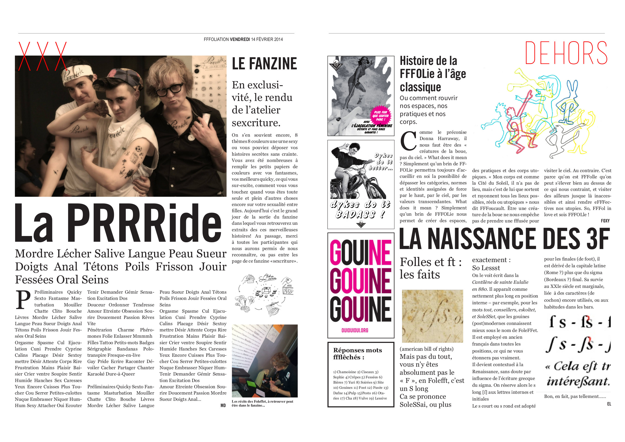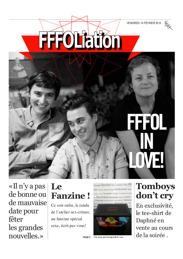 Le soir de la FFFol in Love du vendredi 14 février, nous, les 3 de Foleffet, Cha, Yuri et Sophie*, avons eu l’immense honneur de recevoir un exemplaire d’un journal intitulé "Fffoliation". Ce pastiche de Libé était un vrai journal d’une dizaine de pages, préparé par Fox de Bergerac et Marthe Oh, avec l’aide de très nombreuses ami.e.s : Fuk The Name, Blan, Dures a Queers, Le Bucheron, Le Beau Vice et K, Les Dégommeuses, OuiOuiOui, Sophie Anquez, Dafne Panda Rebel...