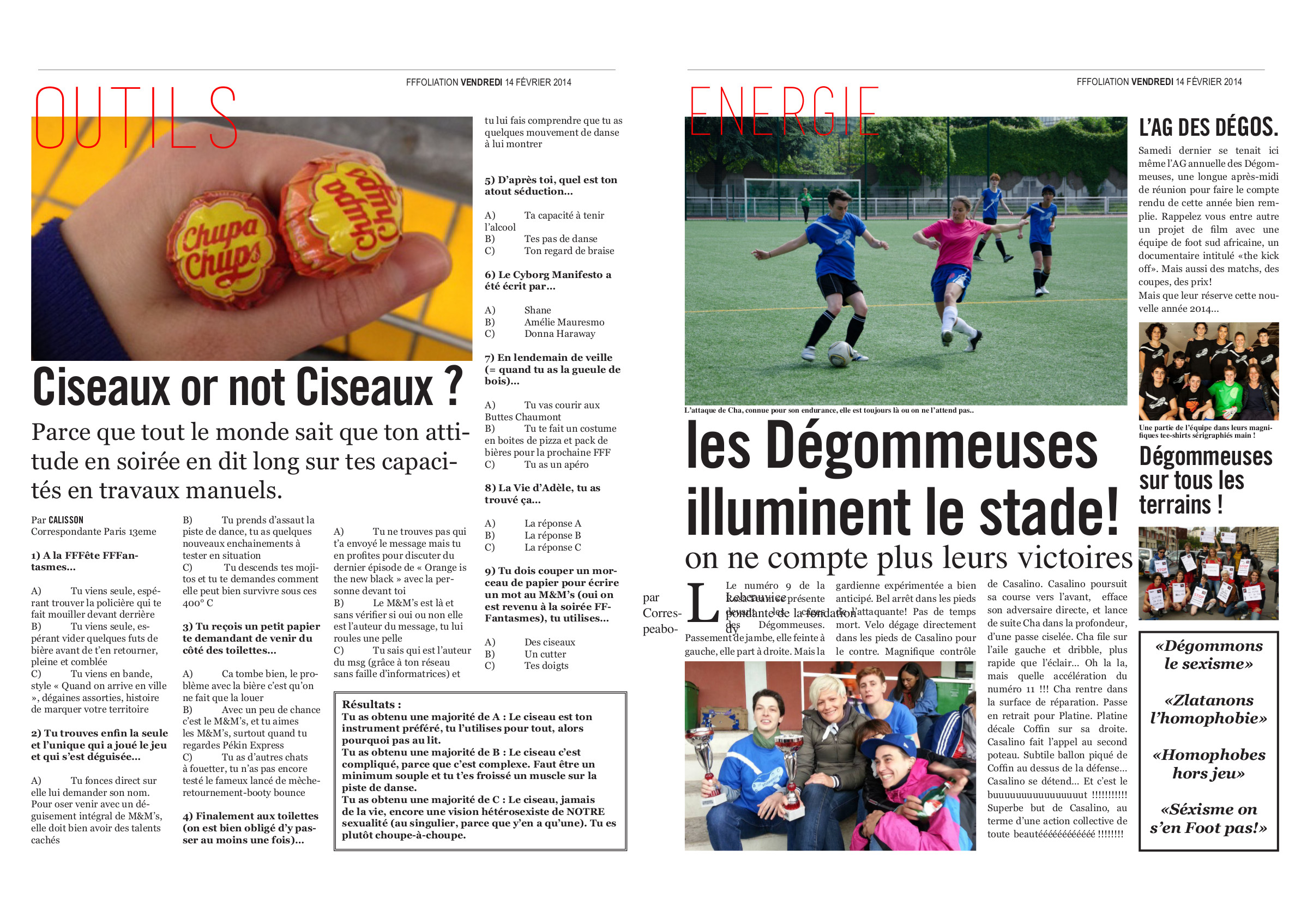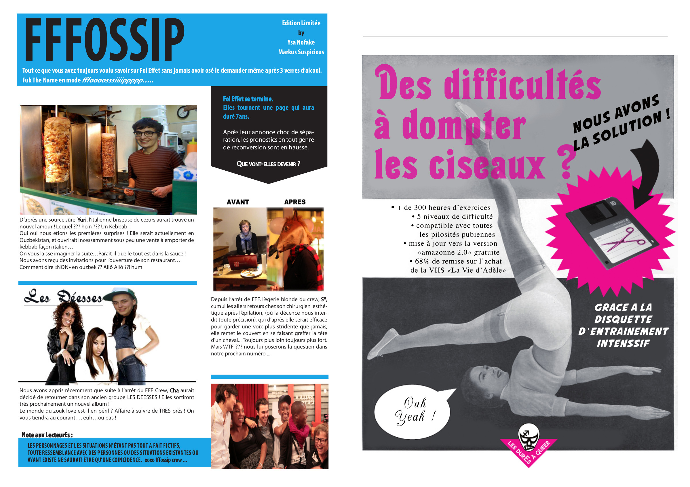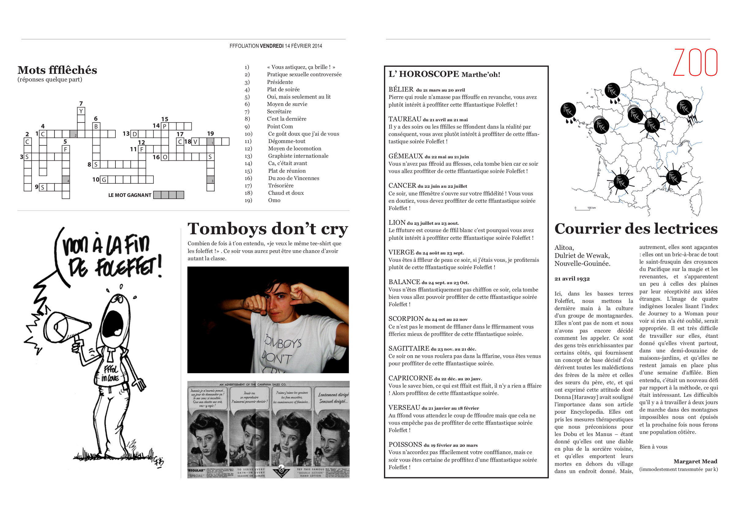 Le soir de la FFFol in Love du vendredi 14 février, nous, les 3 de Foleffet, Cha, Yuri et Sophie*, avons eu l’immense honneur de recevoir un exemplaire d’un journal intitulé "Fffoliation". Ce pastiche de Libé était un vrai journal d’une dizaine de pages, préparé par Fox de Bergerac et Marthe Oh, avec l’aide de très nombreuses ami.e.s : Fuk The Name, Blan, Dures a Queers, Le Bucheron, Le Beau Vice et K, Les Dégommeuses, OuiOuiOui, Sophie Anquez, Dafne Panda Rebel...