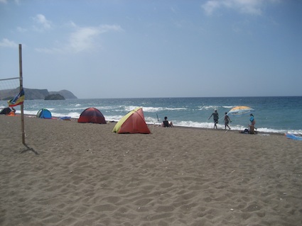 Le deuxième jour c’est celui de l’expédition plage. On nous a bien dit qu’il y aurait une plage lesbienne nudiste. Nous on est prêtes. On part le matin avec plein de doutes : comment va-t-on reconnaître cet espace révolutionnaire ? Rien de plus simple. Malgré le fait que la plage d’Eressos est longue de 4km, le carré lesbien est assez visible. Un filet de volley avec drapeau arc-en-ciel, des filles qui campent, des matelas gonflables matrimoniaux flottent sur l’eau avec à bord des couples lesbiennes nues. On y est ! Et on y restera.