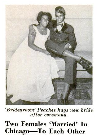 Edna Knowles, on the left, and Peaches Stevens were wed in Liz’s Mark III Lounge, a gay bar on the South Side of Chicago, “before a host of friends and well wishers.” The article ended by noting, “although the duo has a type of ‘marriage license’ in their possession, the state’s official marriage license bureau reported it had no record of their license.” This ending serves to remind Jet readers that Knowles and Stevens’ union was not legitimate in the eyes of the state, as does the use of quotes around the word “married” in the headline." [2]