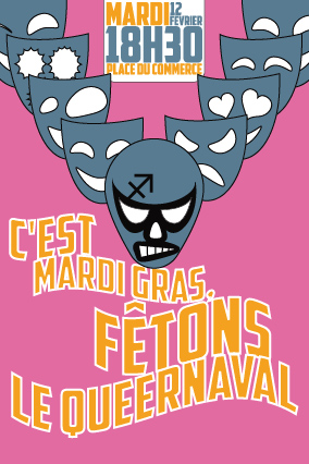 "Le 12 février, les DurEs à Queer vous invitent à célébrer le vote solennel* de la loi qui consacre les premiers pas vers l’égalité des droits entre les sexualités ! Quoi de mieux en effet que le Mardi-Gras pour se féliciter des combats menés et montrer que nous sommes toujours plus que mobilisEes pour la PMA. Quoi de mieux que cette fête où, traditionnellement, le peuple subvertit l’ordre établi, où le valet se fait maître, où les hommes se font femmes et vice et versa, où les enfants s’octroient des droits d’adulte. Il s’agit bien pour nous de se réjouir des prémices de la fin de ce monde où seule l’hétérosexualité a droit de cité, de dénoncer la mascarade homophobe, afin d’avancer avec fierté sur le char du progrès qui ne connaît pas la marche arrière ! Soyons folles, soyons orgiaques, soyons dionysiaques, soyons arlequinEs... soyons nombreuSES !
