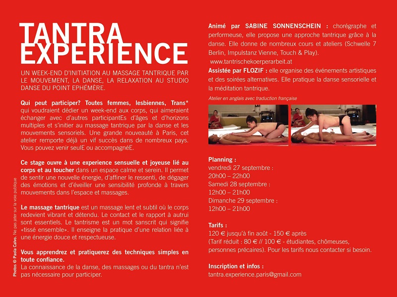 L’atelier est animé par SABINE SONNENSCHEIN : chorégraphe et performeuse, elle propose une approche tantrique grâce à la danse. Elle donne de nombreux cours et ateliers (Schwelle 7 Berlin, Impulstanz Vienne, Touch & Play).