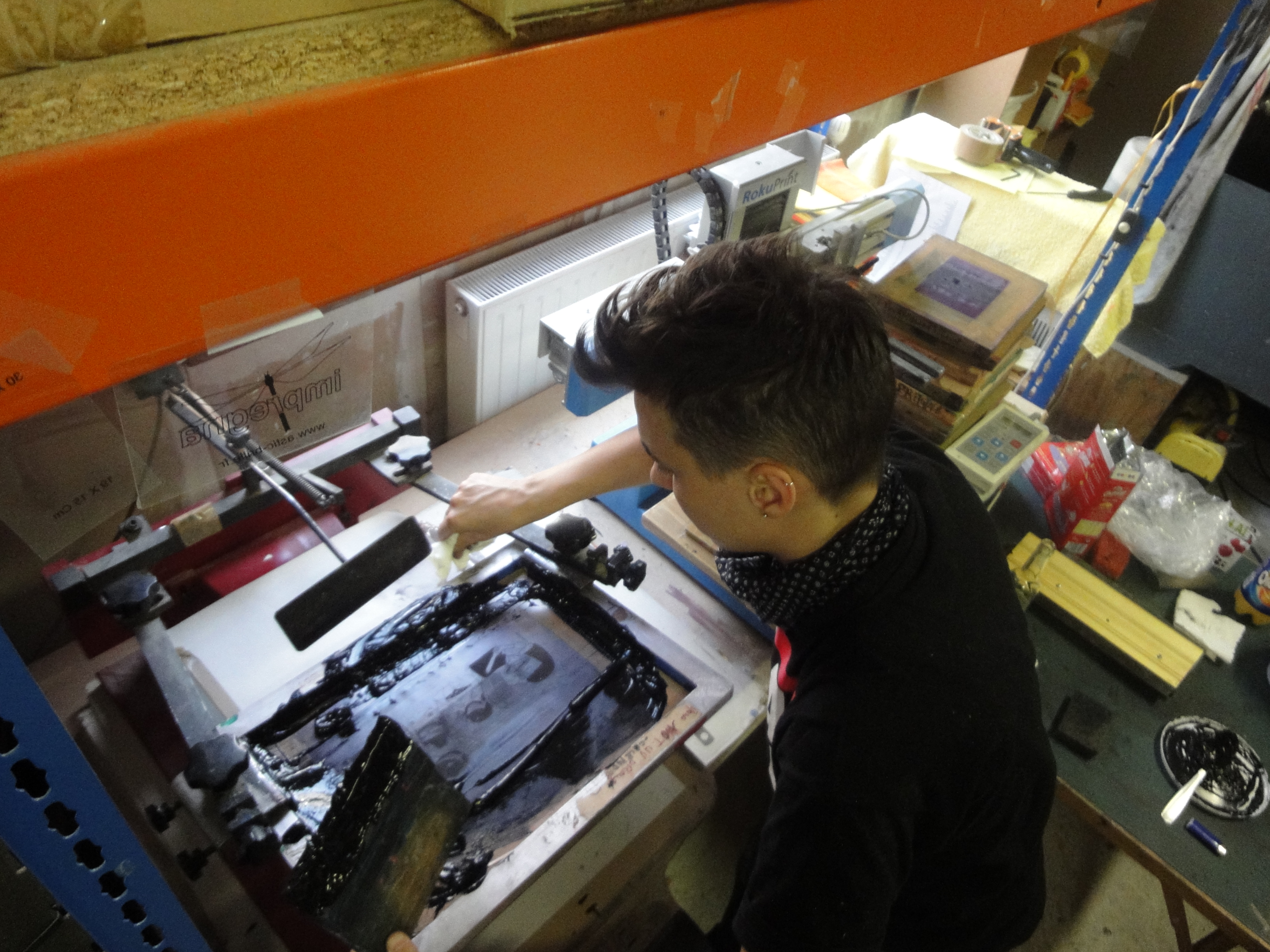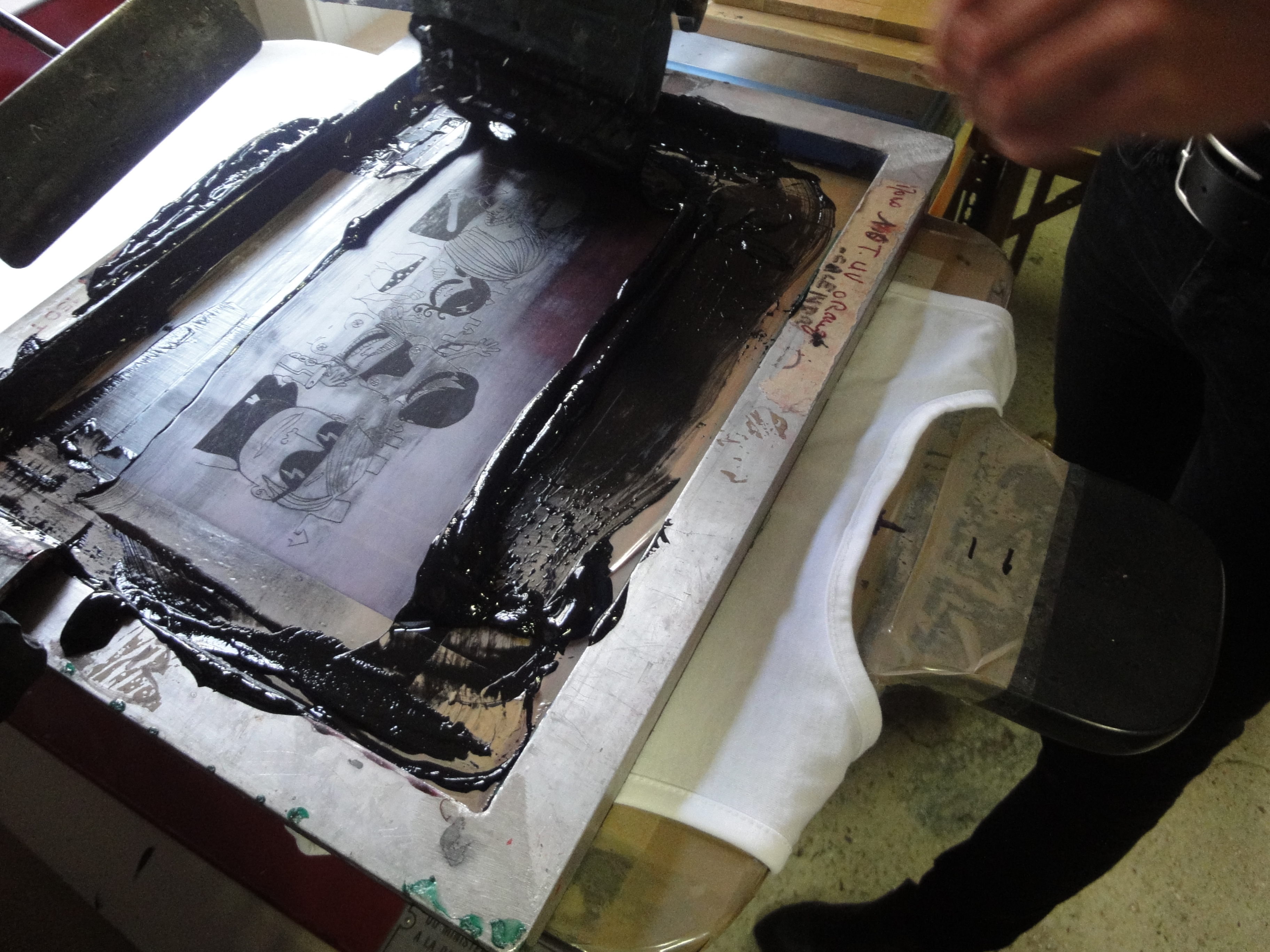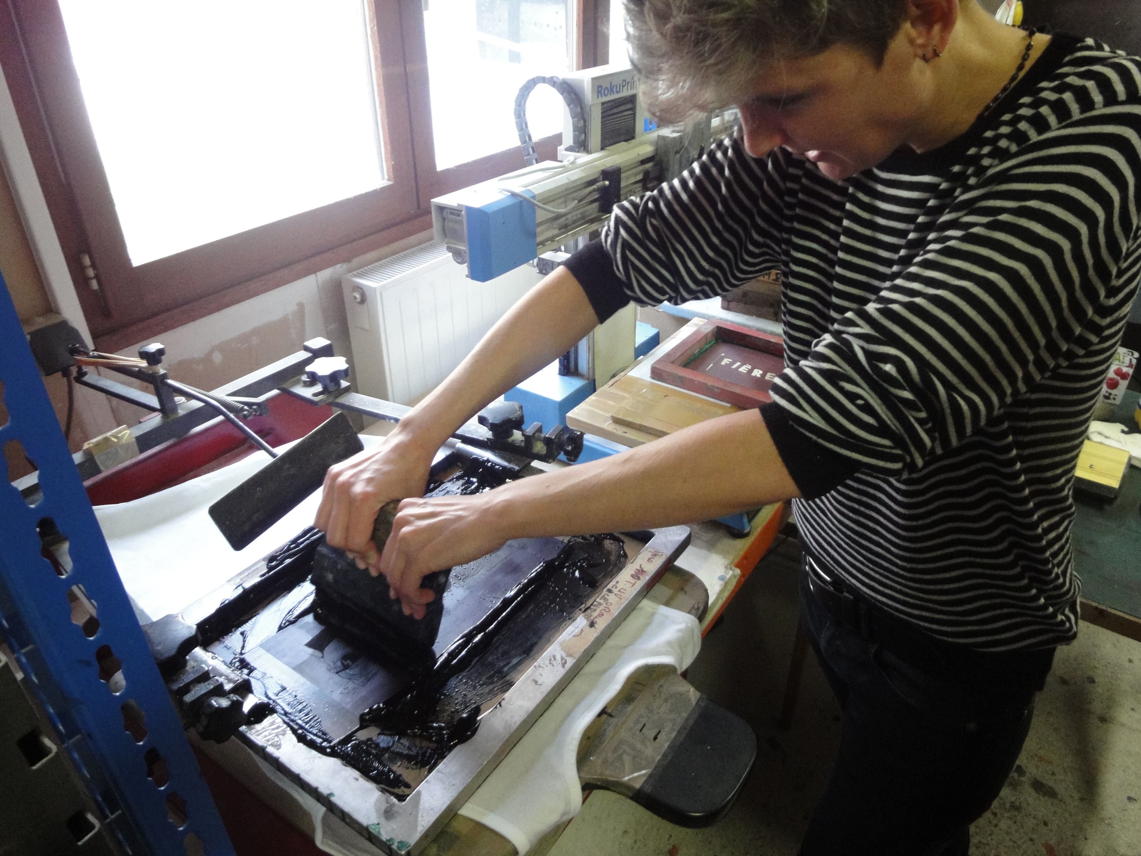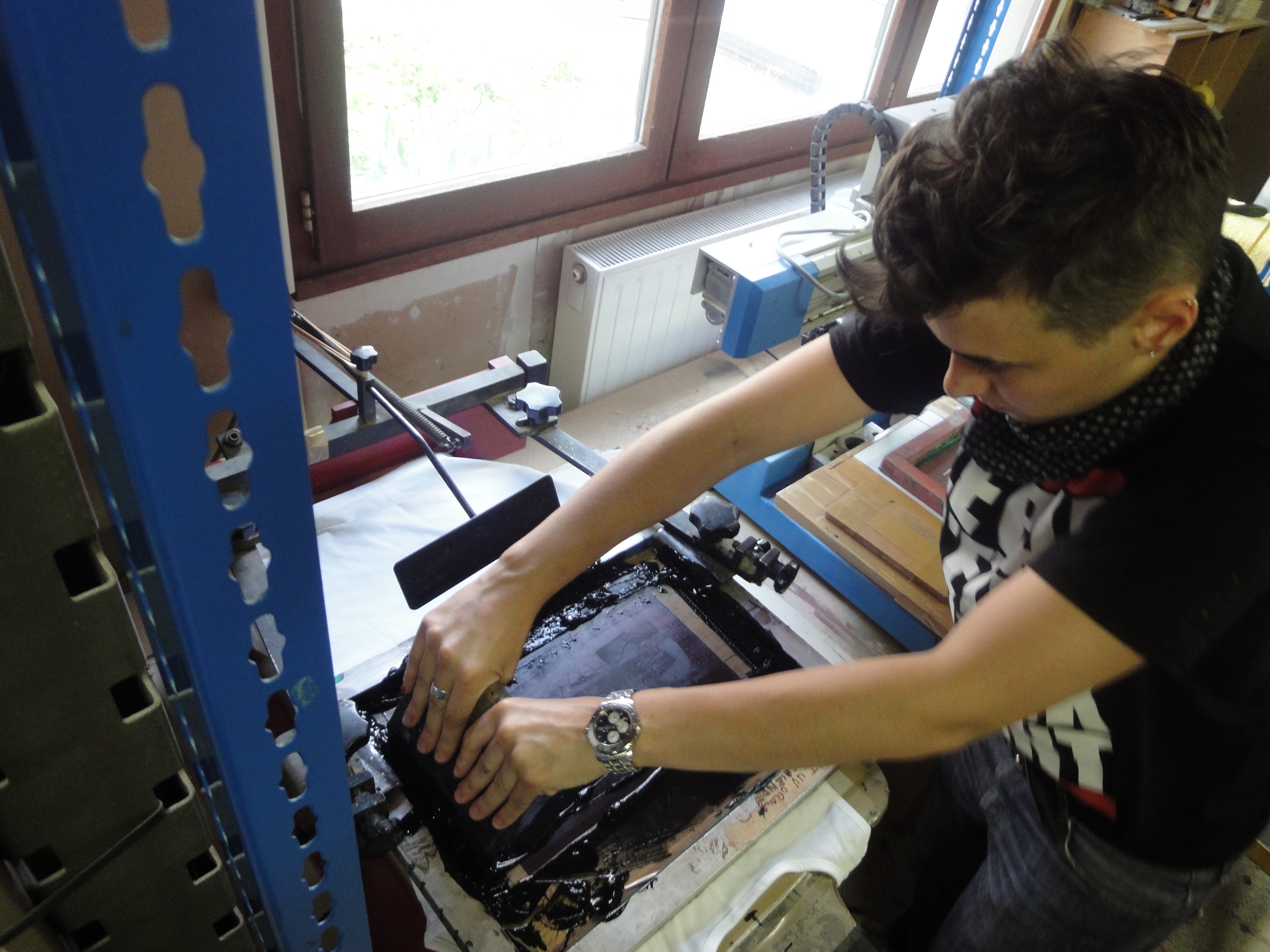 3/ on fait passer l’encre à travers le cadre à l’aide d’une raclette