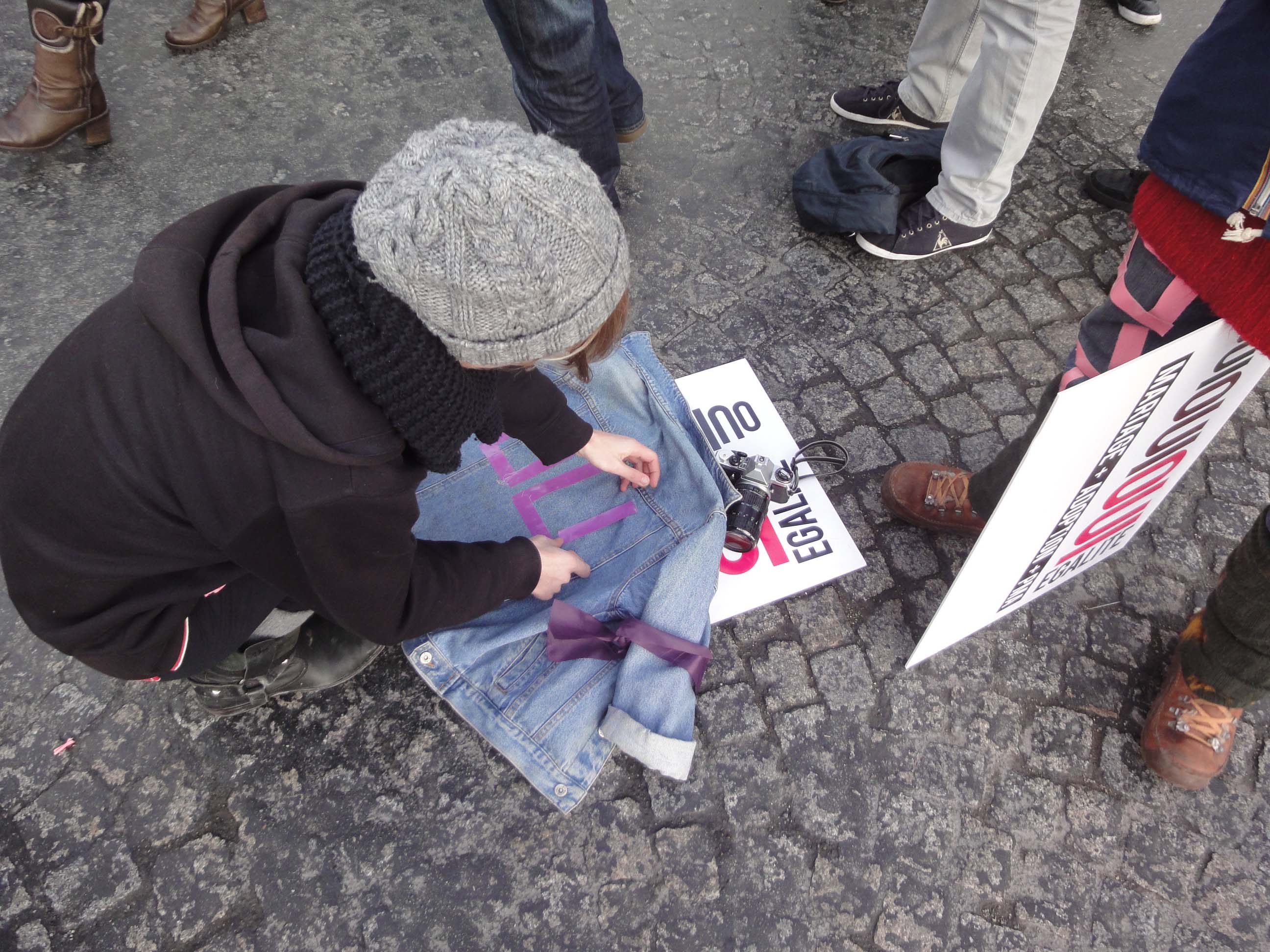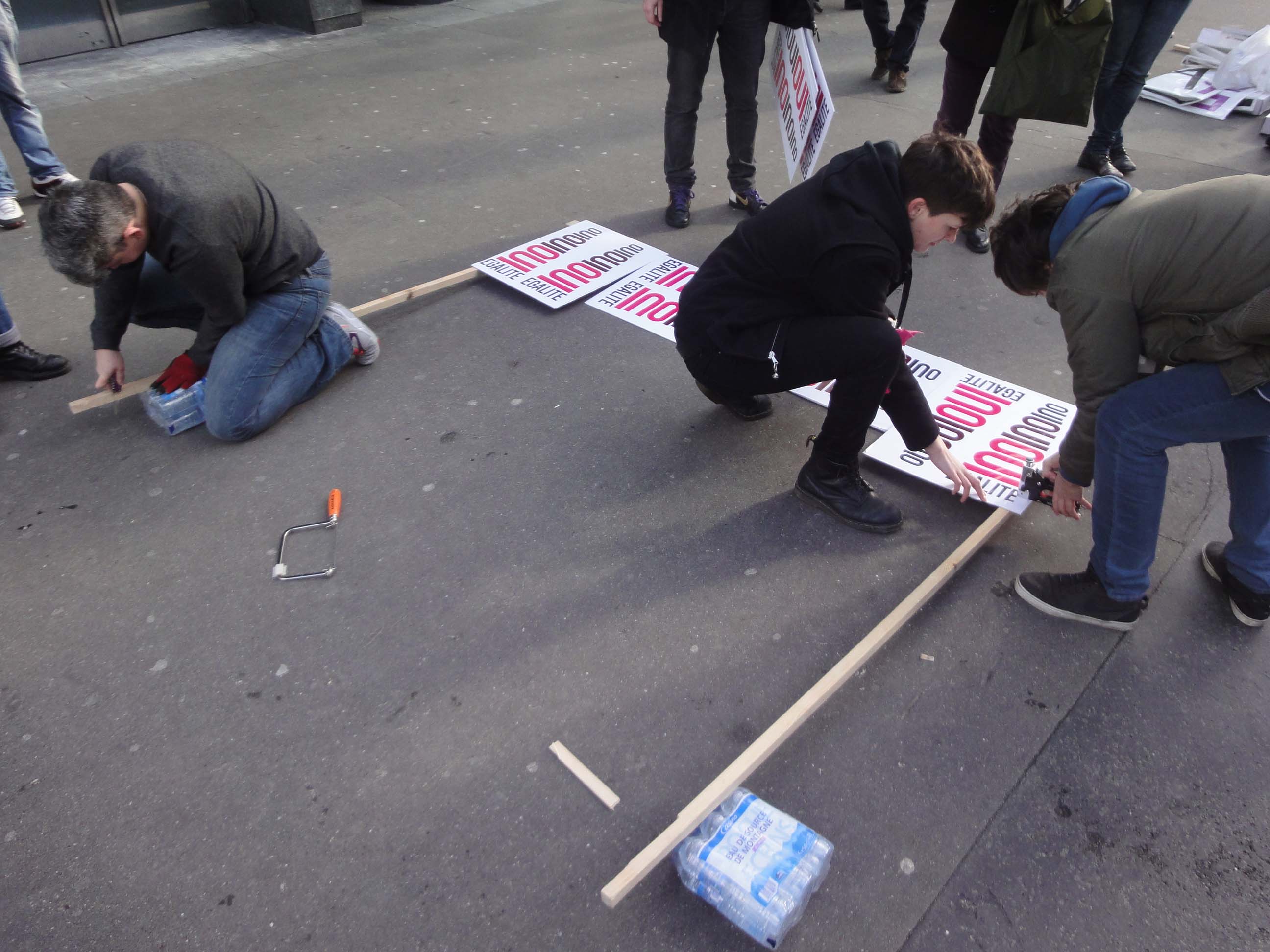 La foule arrive, c’est le moment de distribuer les pancartes.
