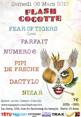 Côté musique, ce sera le grand luxe puisqu’on reçoit en exclusivité Fear Of Tigers, "le" DJ à découvrir si ce n’est déjà fait, à écouter à volonté et à observer de près en ce moment et pour longtemps. Dans son album au nom à coucher dehors, ’Cossus Snofsigalonica’, il fait vivre tout un wonderland peuplé de créatures célestes qui tripent allègrement dans des volutes d’opium de toutes les couleurs, un son unique, alliage fantastique d’indie-electro et d’essence dance puisée dans les meilleurs crus 90’s avec notamment une cover improbable de T he Rhythm of the night de Corona ou un sample très habile des Dee-Lite, un joyau sonore qu’il reconstituera en live pour qu’on groove à bras grands ouverts !