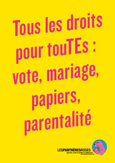 Les Panthères roses seront à nos côtés à tou.te.s ce dimanche à la manif contre l’homophobie, pour l’égalité des droits, tous les droits, pour le mariage, pour la PMA, pour la filiation.
