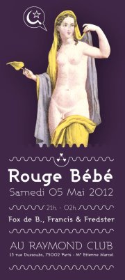 « Bébé voit rouge pour sa troisième soirée chez son papa @Raymond Club. Il sort la faucille pour fêter le vent frais de la révolte qui souffle dans tes cheveux. Fais tomber les couches, ça va pulser du booty. Rouge Bébé est OPEN QUEER comme la crew aux platines avec Fredster (Mascara Disorder), Fox de Bergerac (Dyke Air) et Francis (tout et n’importe quoi). »
